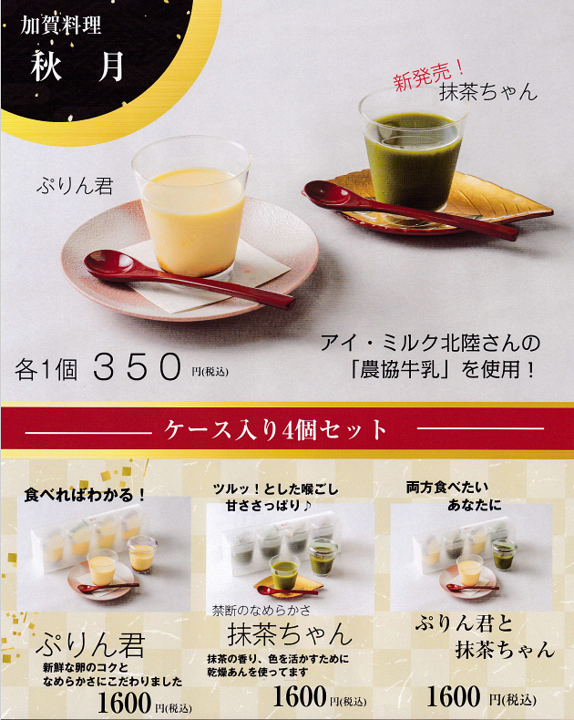 記事一覧 1件中 1-1 を表示 2026 おせち受付中 2025-09-13 2026おせち受付スタート!今年は2種類「ひとり一重」限定100台 15,000円(税込)「2段重」限定100台 25,000円(税込) ※前日までのご注文、ご来店でのお受け取りとなります メニュー 特上うな重 税込5,000円 約200gオーバーの肉厚な特上の国産うなぎを使用し、特製のタレでじっくり焼き上げ、ふっくらと柔らかに仕上げています。 上うな重 税込2,700円 創業三十年以上の「秋月」だからこそ出来るこだわり抜いたとろける鰻。200gオーバーで厚み、大きさ、脂ノリの良い鰻を使用。 秋月弁当「花」 税込4,860円 ローストビーフ、きんぴら、煮物、笹巻き麩、鰤西京焼き、甘辛とり天婦羅など、人気料理を詰めました。 秋月弁当「月」 税込3,780円 ローストビーフ、塩鮭、竹輪磯部天、帆立フライ、海老、がんも、貝旨煮、蕗など、彩り豊かなお弁当です。 秋月弁当「雪」 税込2,700円 ローストポーク、煮物、塩鮭、とり天婦羅、牛蒡天婦羅、玉子焼きなど、女将オススメが詰まったお弁当です。 ローストポーク弁当 税込1,500円 構想3年!調理3日!長時間低温調理したローストポークを、ご飯の上にたっぷりと。甘めのタレが絶品です。 ローストビーフ弁当 税込1,500円 柔らかくて食べやすい板前が作った自家製ローストビーフをきんぴら牛蒡と合わせてご飯の上へ。さっぱりとした肉が絶品です。 甘辛とり天弁当 税込1,300円 人気の甘辛とり天婦羅をたっぷり詰めました。大人から子供まで楽しめます。 大人のお子様弁当 税込1,500円 海老フライ、ハンバーグ、赤ウィンナー、ナポリタン、玉子焼き、甘辛とり天婦羅等、お子様が大好きなものを詰め込みました。 限定・季節の日替わり弁当 税込1,200円 ※300個限定、完売次第終了となります。季節のこだわり食材を使用し、内容は板前おまかせのお得な特製お弁当です。 オードブル(4〜5人分) 税込8,640円 和食の粋を超えた15種類ほどのお料理がたっぷり入ります。季節や仕入れ状況によって内容は変更になります。 なめらかプリン・抹茶水羊羹 1個 350円 なめらかプリン! 食べればわかる究極のなめらかさ抹茶水羊羹! ツルッとしたのどごし 甘さひかえめ 治部煮レトルト 1080円(税込) 加賀料理 秋月の本格治部煮!〈こだわり〉素材は国産の鶏もも肉、金沢名産すだれ麩や加賀の野菜を使用。餡は3日間かけて作った出し汁にとろみつけ旨みを凝縮! 受付時間 9:00〜21:00(火曜定休) 前日の正午12時までにご注文をお願いします。 賞味期限は当日限りとなります。 お受け取りは当日10:00〜19:00までに「秋月」までご来店ください。